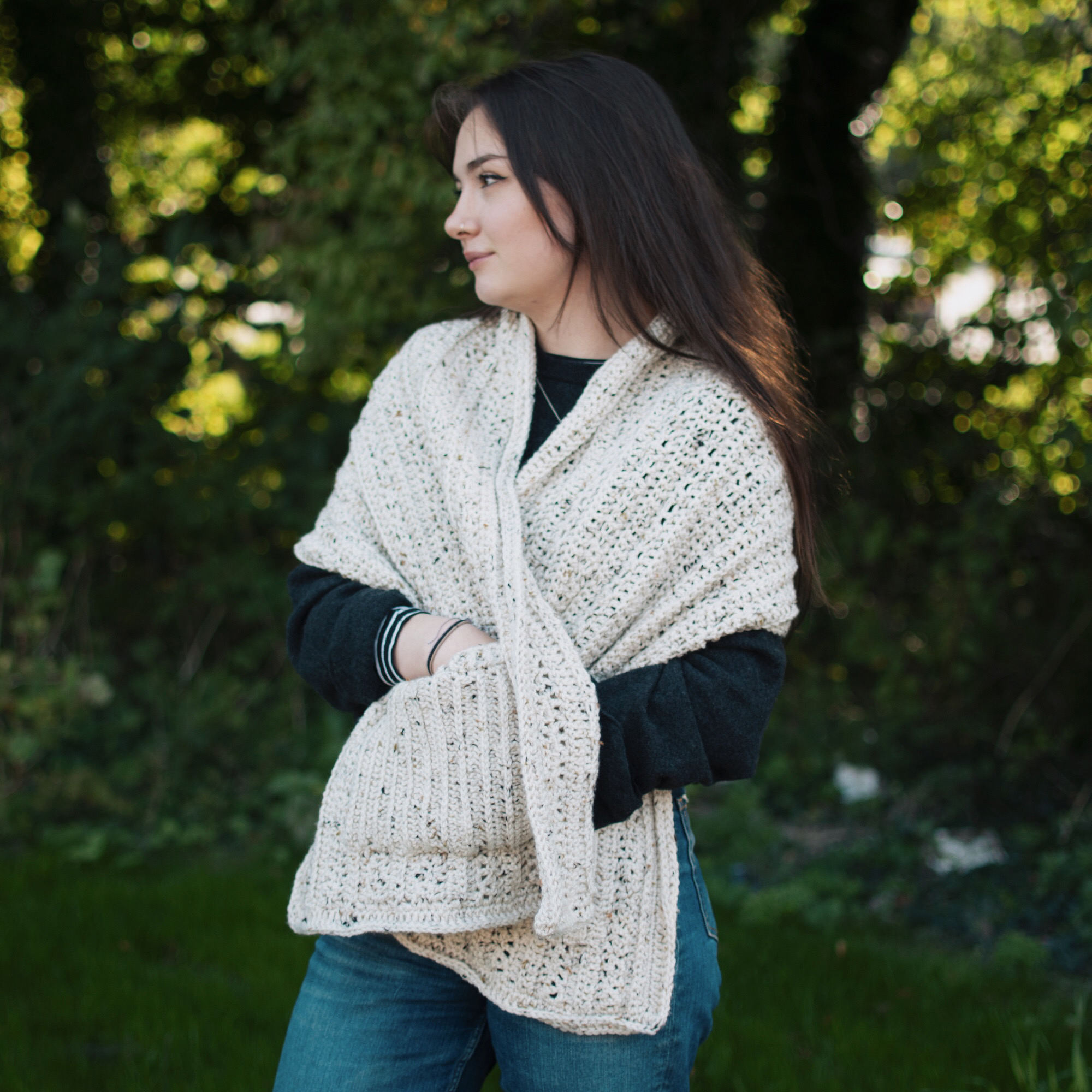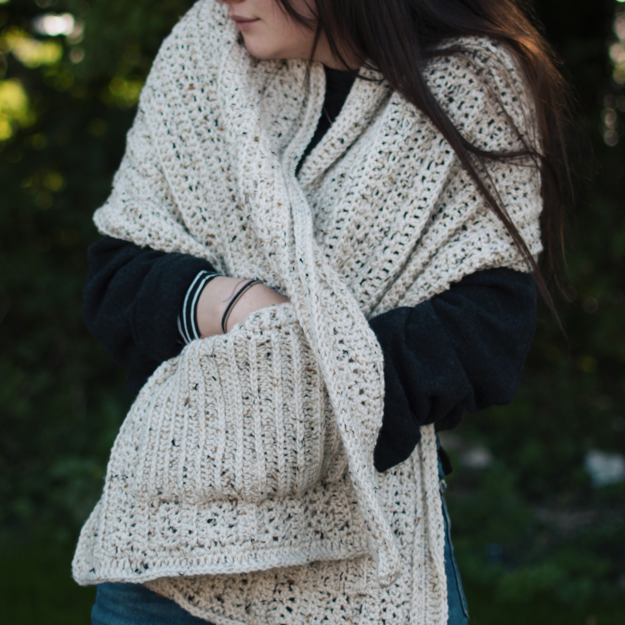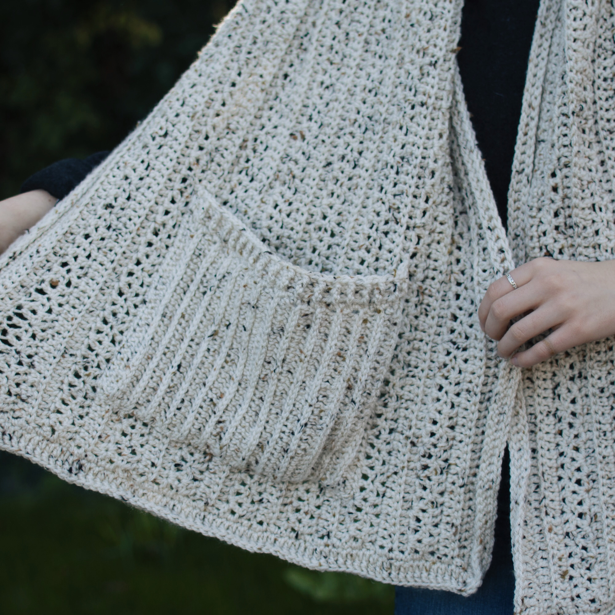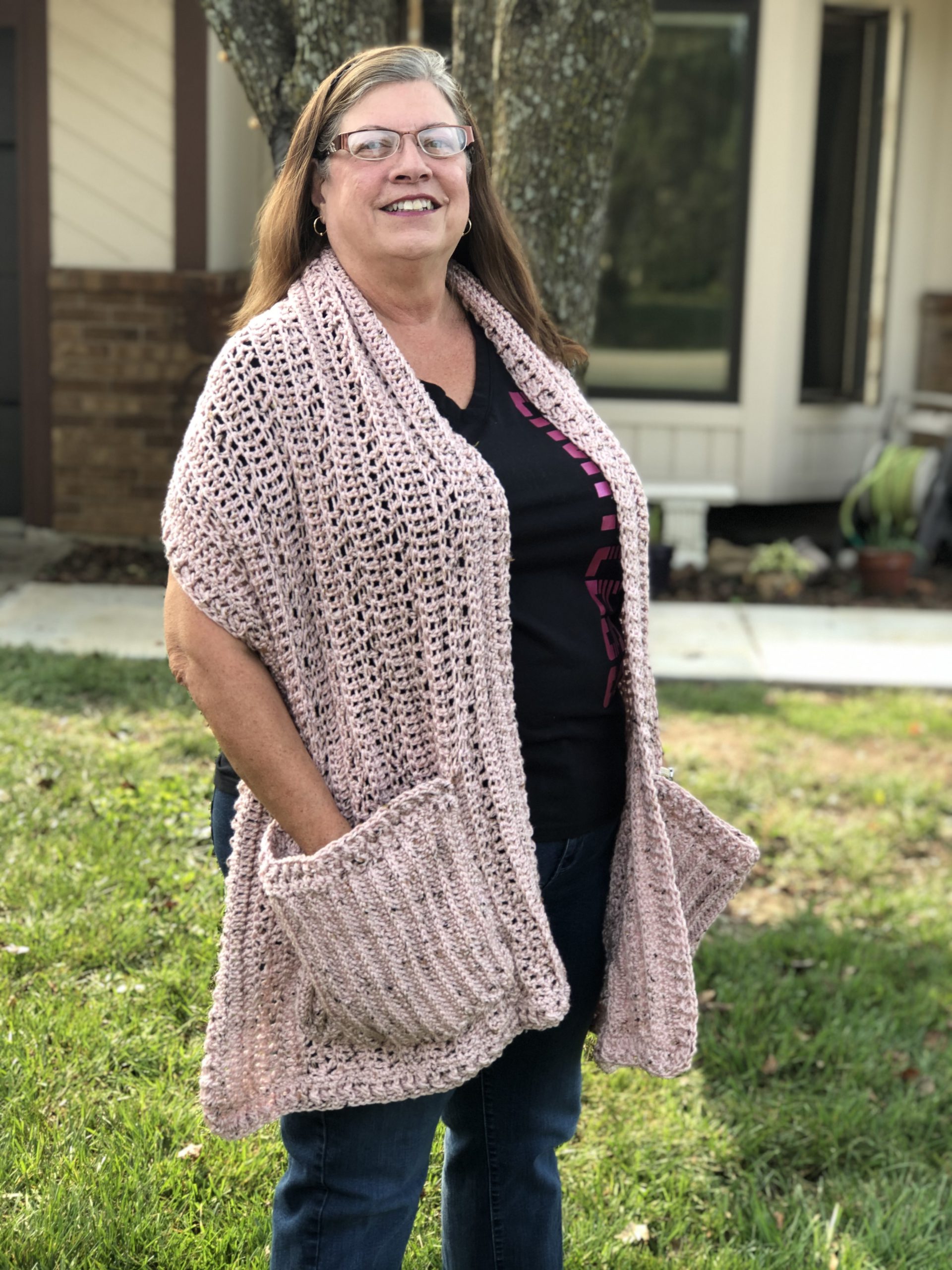 The Fireside Pocket Shawl is officially my new favorite pattern of ours! I love how it drapes. It just makes this amazingly comfy garment that is so popular right now! I wanted a ribbed look but I also wanted some slight lace to it–but not too lacy, because we are heading into cooler temperatures, after all!