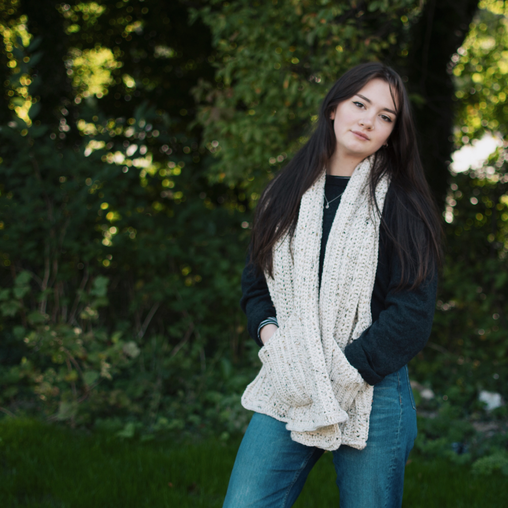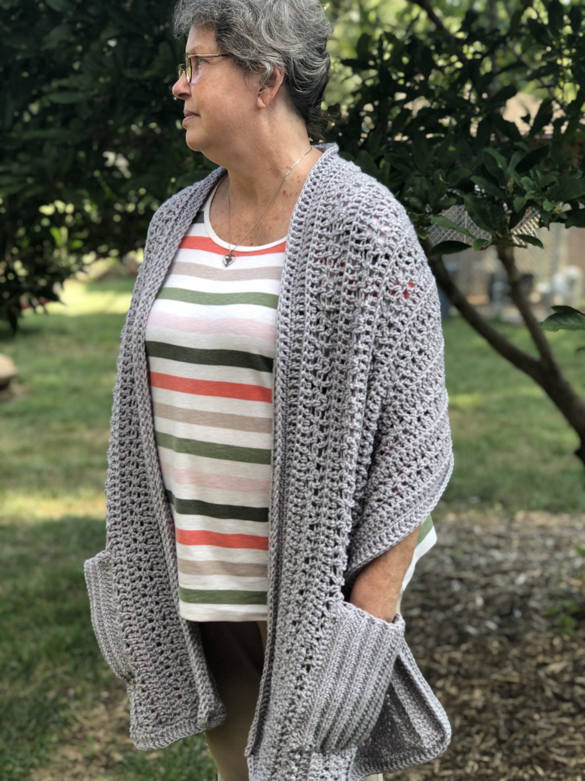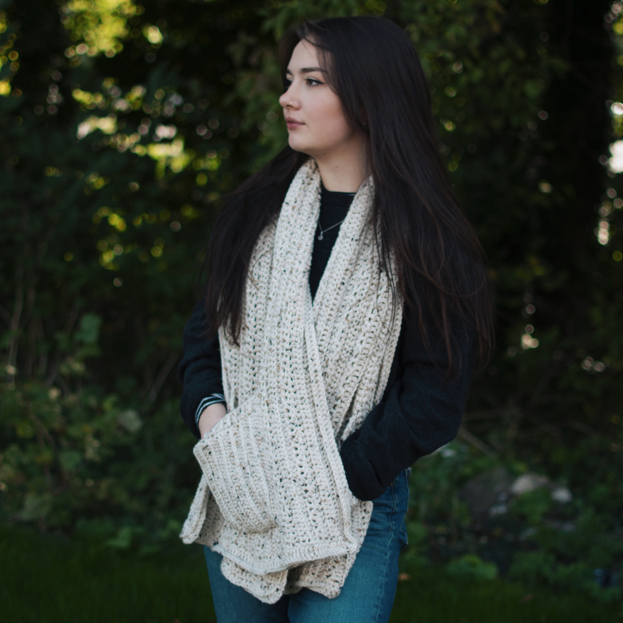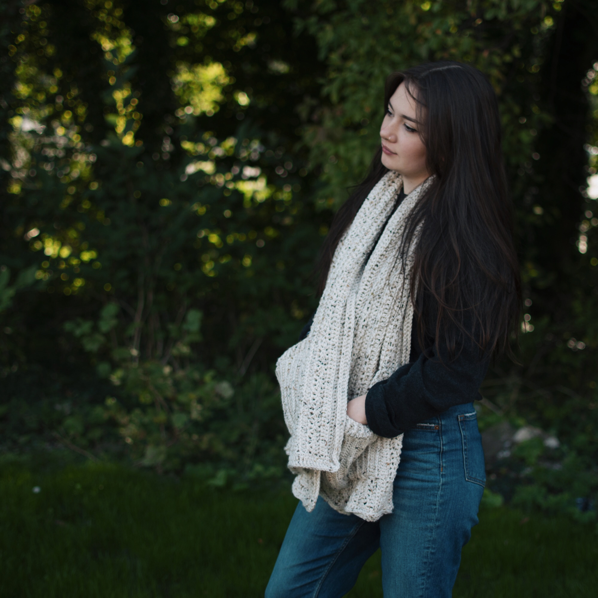 The Fireside Pocket Shawl is officially my new favorite pattern of ours! I love how it drapes. It just makes this amazingly comfy garment that is so popular right now! I wanted a ribbed look but I also wanted some slight lace to it–but not too lacy, because we are heading into cooler temperatures, after all!