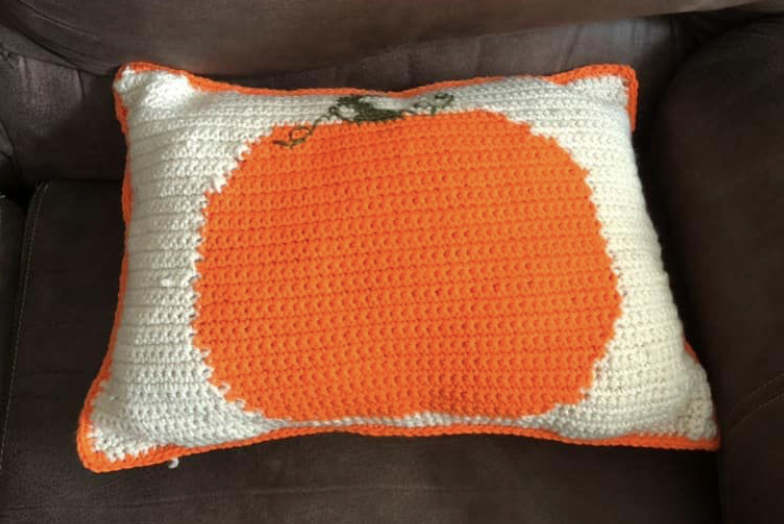 Before I add the photo of this one, it was a pattern originally designed for Halloween, but someone in the CAL left off the face and just made it a plain pumpkin, and it looks fabulous! This one was turned into a Pumpkin pillow! So if you want to work this one, then substitute the black for orange in the instructions. You can find the free pattern on the blog here. (I cannot link both images to the post for this one, so you will need to click the blue writing!)