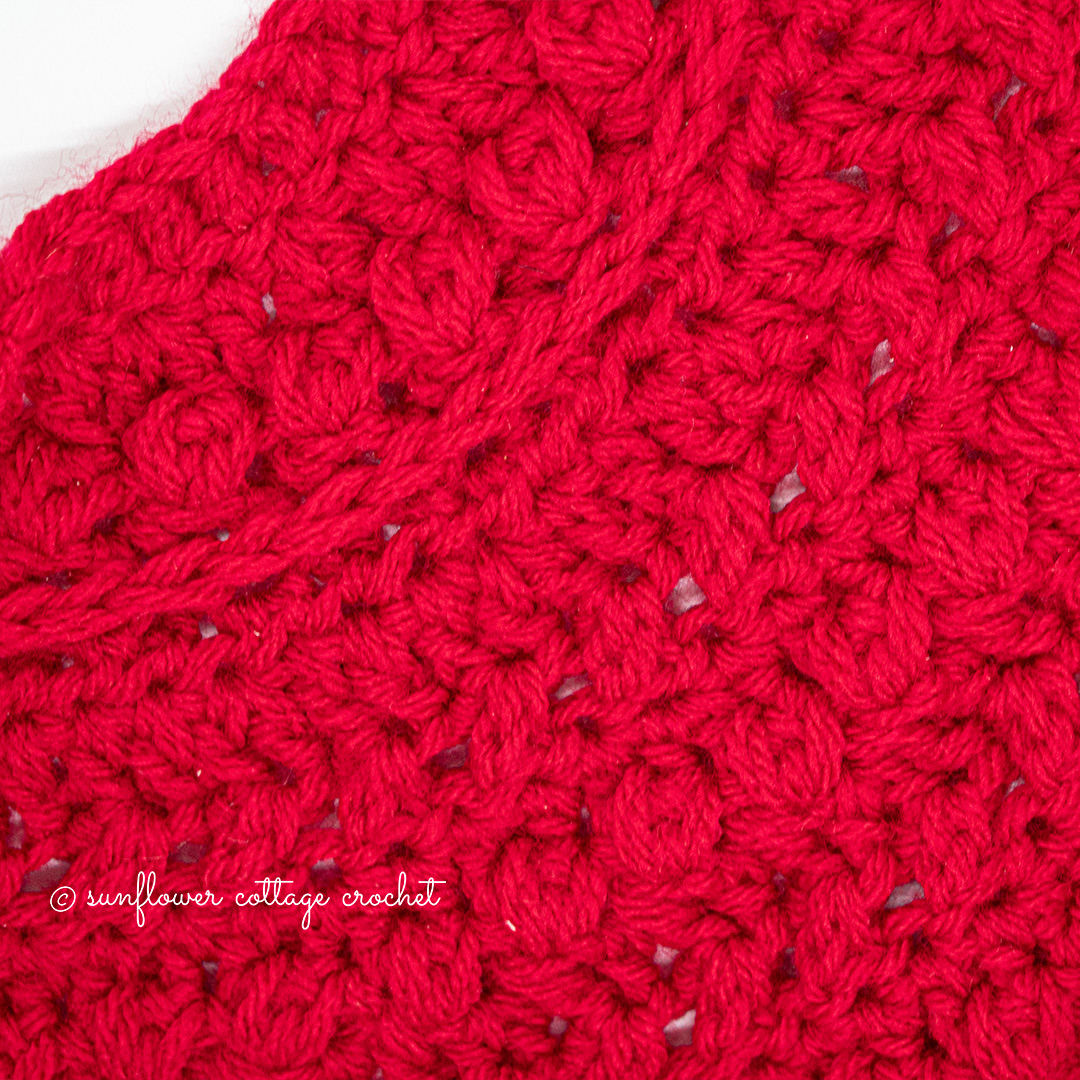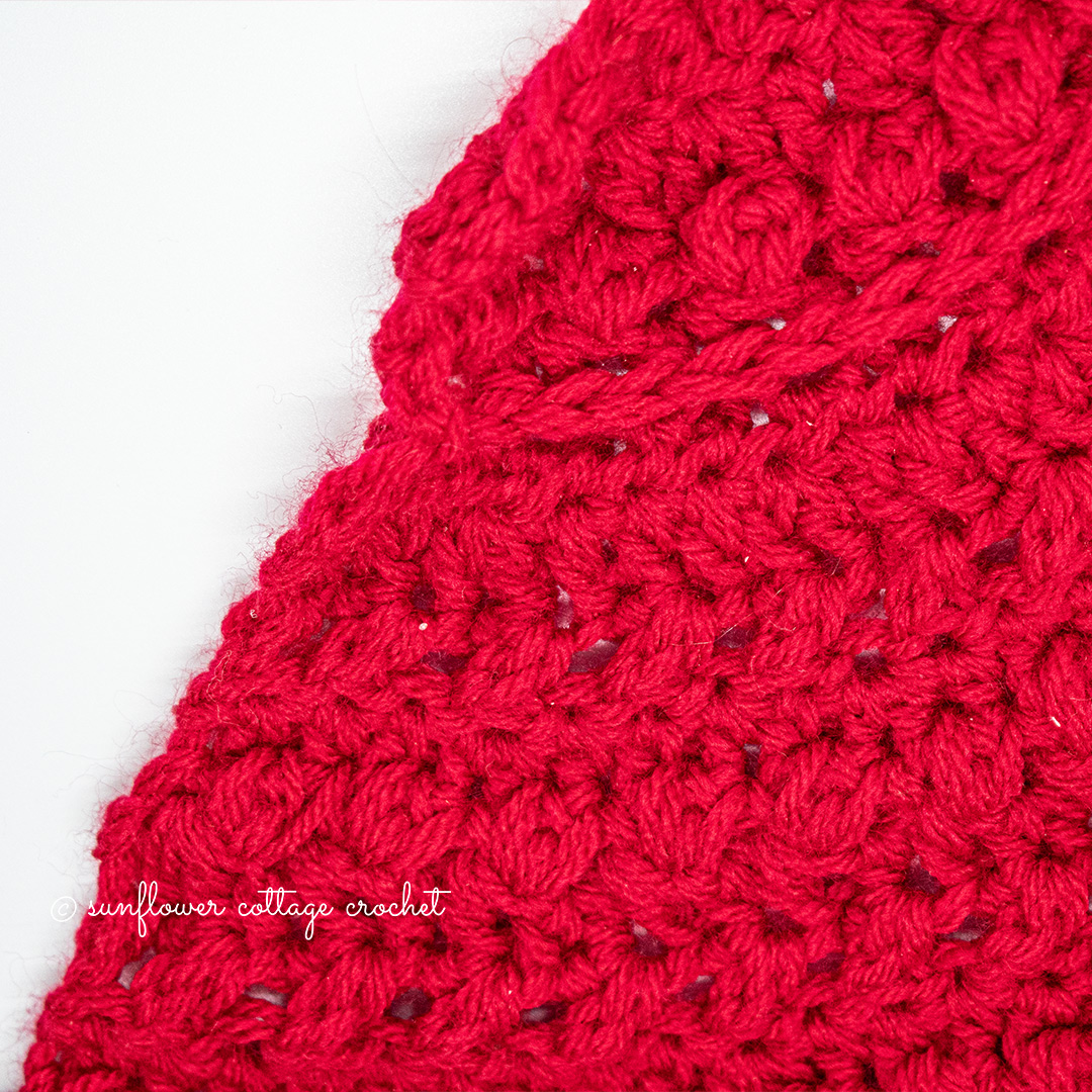 Row 10: (RS) CH2, turn, 2DC in first st, *HDC on top of berry st, DC in next st, HDC on top of next berry stitch, DC in next st, 2HDC on top of next berry st, DC in next st*, Rep from * to * across until 2 sts remain, HDC on top of next berry st, DC in last st. (88)